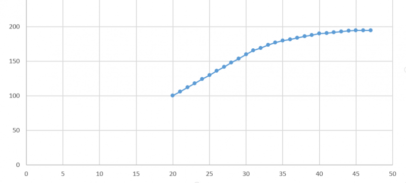 Man trägt nun (per Hand oder mit einem Computerprogramm wie EXEL) die Herzfrequenz in Funktion der Geschwindigkeit ein. So sollte man in etwa eine Graphik erhalten die folgende.