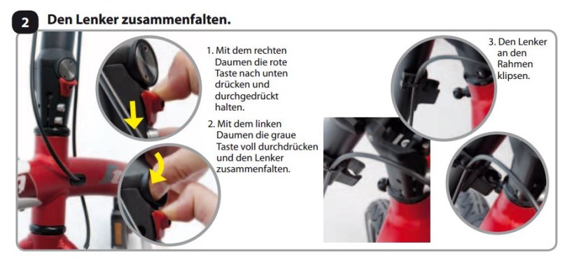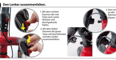 Witziger Weise ist in der Bedienungsanleitung zum Klapprad angegeben, dass man mit dem Daumen der rechten Hand den einen den Hebel bedient und mit dem Daumen der linken Hand dann auf den Knopf drückt.