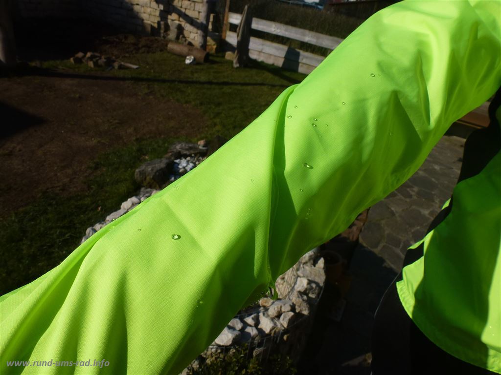 Man sieht deutlich, wie das Wasser abperlt, was aber wohl auch daran liegt, dass die Jacke noch neu und damit auch noch frisch imprägniert war.