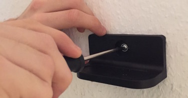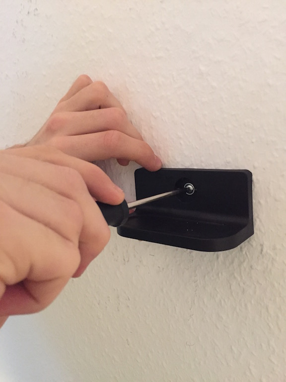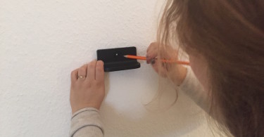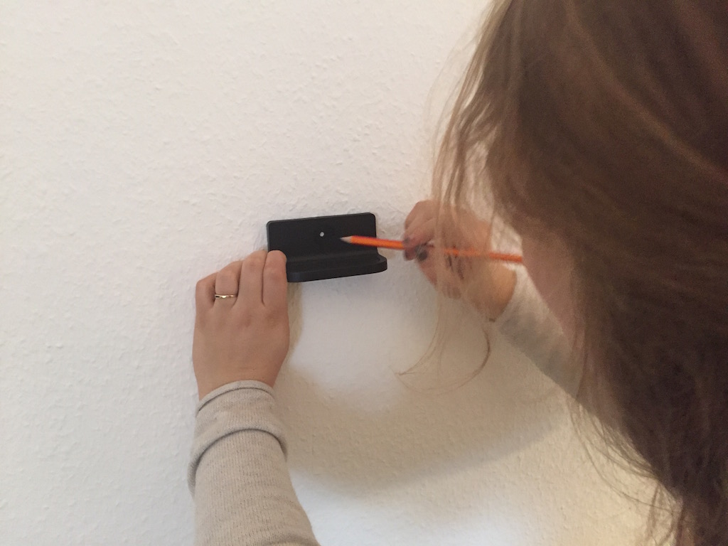Zum Anbohren müssen die Teile des Wandhalters an die Wand gehalten werden. Idealerweise zeichnet man zu zweit an. Trotz Wasserwage und Maßstab zeichneten wir die beiden Reifenhalter auf verschiedenen Höhen an – Für die Stabilität nicht wirklich von Relevanz. Dennoch ist der optische Effekt so eher unschön, zumal die Reifen nun direkt an der Wand anliegen. Die Folgen sind schlieren und Dreck an der Raufasertapekte.