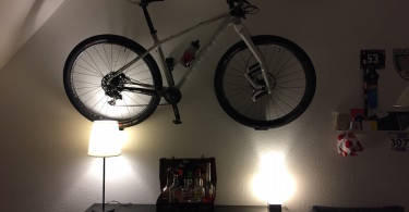 Mein Crossrad (11,2 kg) und mein Racehardtail (8,7 kg) sind im Wandhalter sicher aufgehoben. Keinesfalls Sorgen muss man sich um den Halt des Fahrrades machen – der Cycloc hält mein Bike schon seit Wochen sicher an seinem Platz.