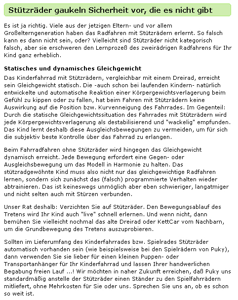Vieles in diesem Artikel stammt erkennbar von Puky (steht vieles so ähnlich auch auf deren Homepage) und ich sehe aus Erfahrung mittlerweile einiges anders als Puky schreibt und möchte es deshalb anmerken.