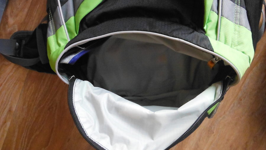Im Rückenbereich ist noch ein weiteres Fach, in dem Karten oder eine 3L Trinkblase Platz finden. Außen sind links und rechts Halterungen / Taschen für Trinkflaschen oder was immer man dort unterbringen möchte. Und was anfangs wie ein Designelement wirkt, ist in Wirklichkeit ein verstellbarer Helmhalter.