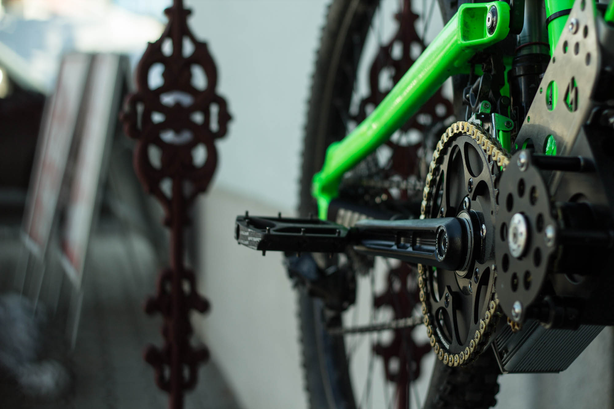 Neben der Optik fallen natürlich auch Feinheiten auf wie der sauber gefräste Träger samt Logo oder die hauseigenen, deutlich massiveren Kurbeln und die goldene Kette welche ebenfalls massiver gewählt wurde um der Kraft entsprechend Stand zu halten.