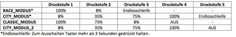 Nach unserem Geschmack war der Race Modus am Besten, denn die hohe Akkulaufzeit zwang uns im Wald eigentlich nie dazu Energie sparen zu müssen und die Druckstufe 2, die Abblendfunktion mit 8% Leistung, bot sich für Fahrten in der Stadt an. Lästiges Durchschalten durch viele Modi entfällt. (Ausleuchtungsvergleich: siehe Berichtende)