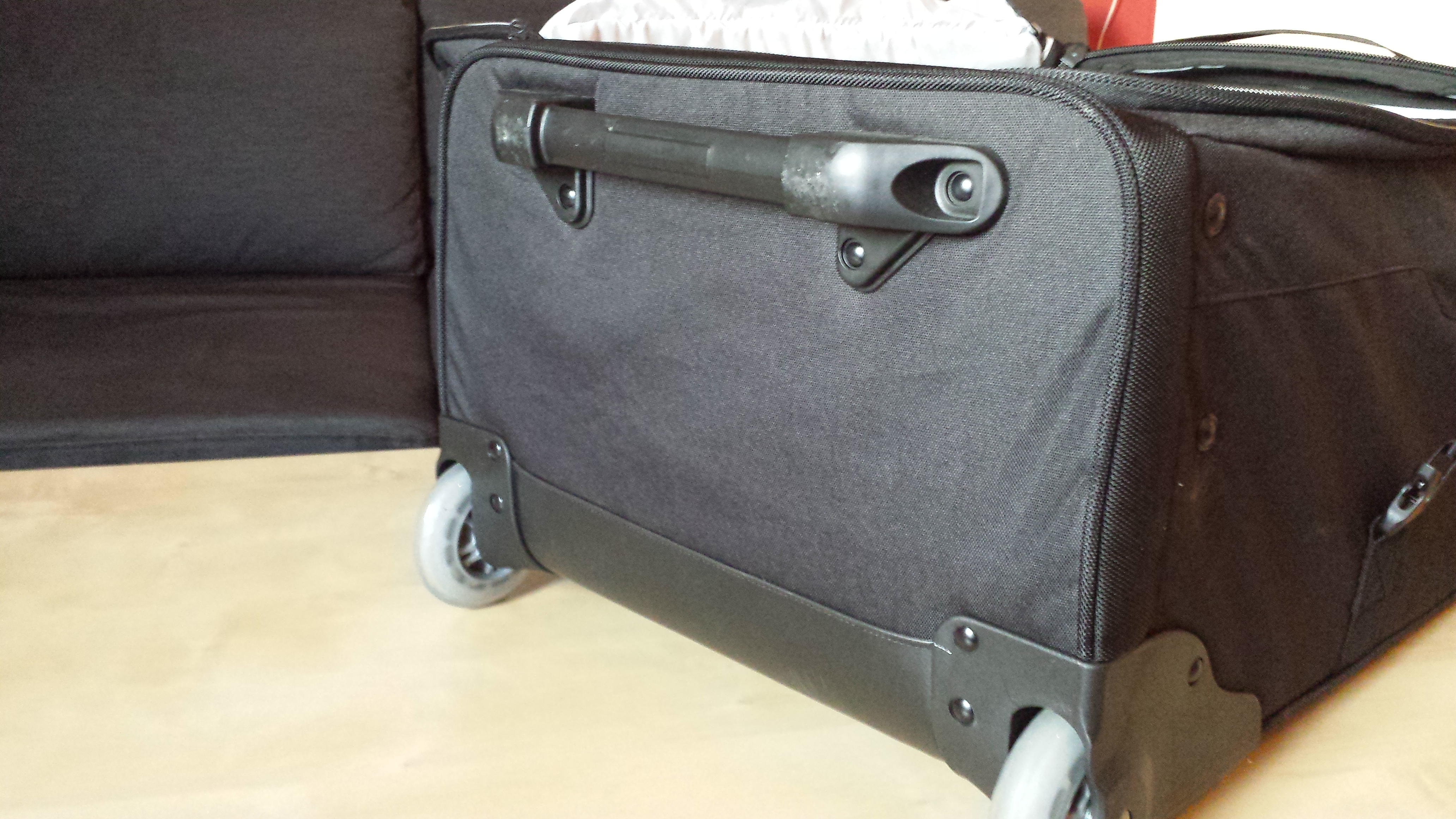 Der Koffer ist mit Rollen ausgestattet und lässt sich prima hinter einem her ziehen. Die Qualität der Skate Rollen ist überragend. Ich kenne bisher keinen Koffer, der leiser und sanfter über Asphalt und Parkplatz-Schotter rollt.