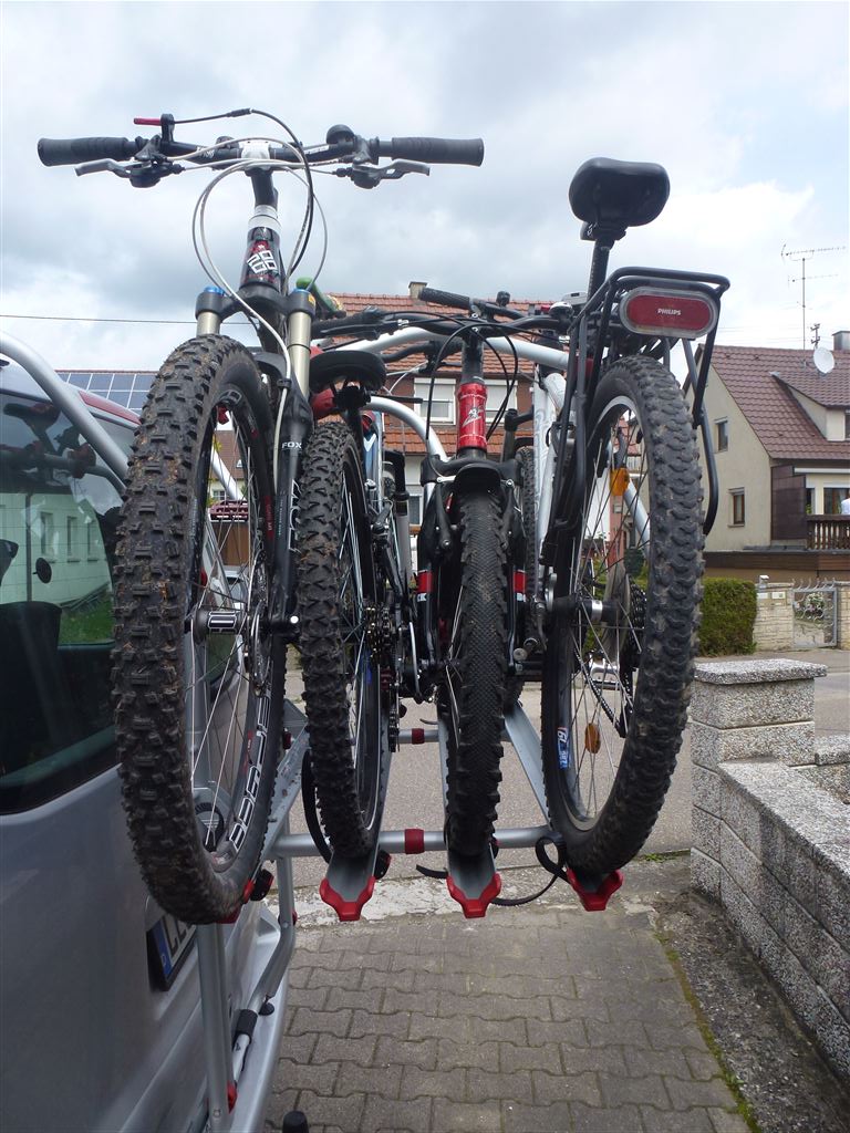 Somit sind also die beiden Fahrräder 1 und 2 am Fahrradträger befestigt und die Fahrräder 3 und 4 hängen am Bike 1 mit dran. Ist im Grunde kein Problem, wäre mal nur interessant zu erfahren, ob die Bike-Blocks darauf ausgelegt sind, dass alle Fahrräder am Träger befestigt werden.