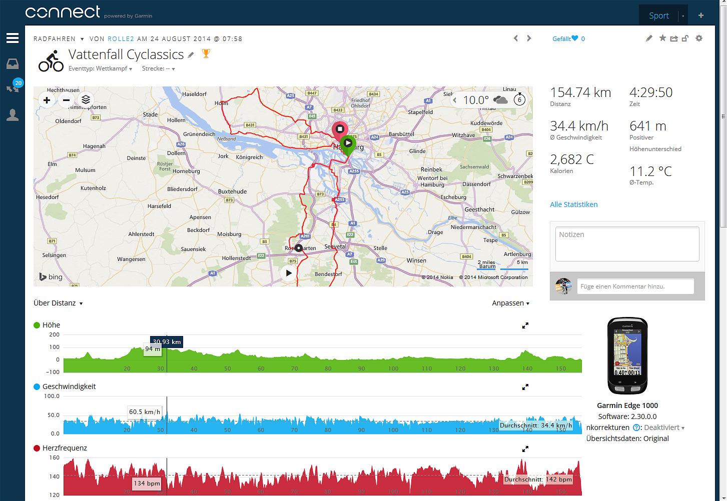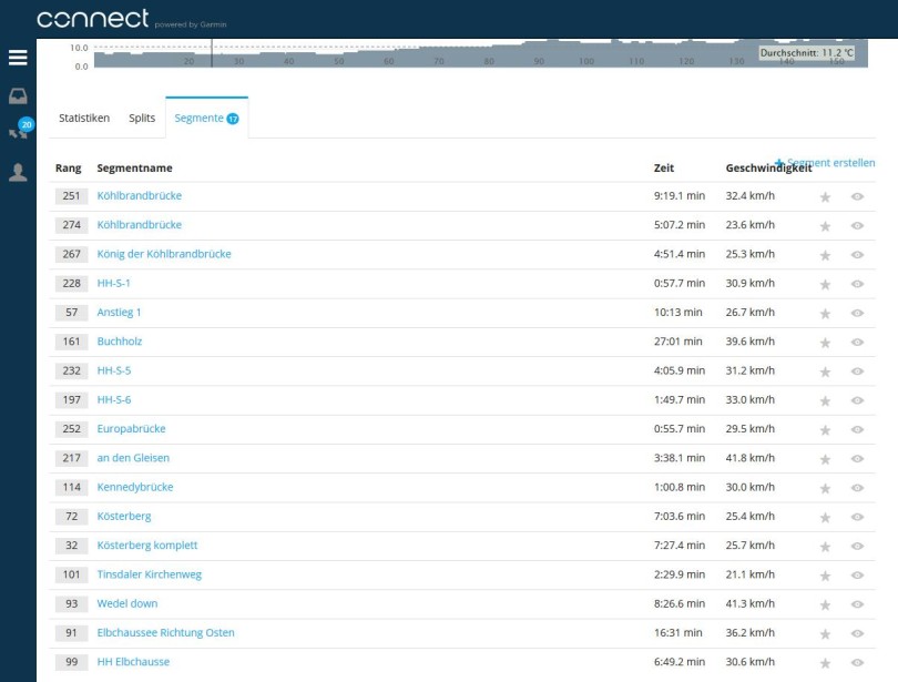 Interessant ist hier, dass die gefahrenen Zeiten dieser Streckenabschnitte von allen Garmin Edge Nutzern genommen und verglichen werden. Als Beispiel ist hier die Strecke des Vattenfall Cyclassics Jedermannrennen gezeigt auf der ich das Edge 1000 dabei hatte.