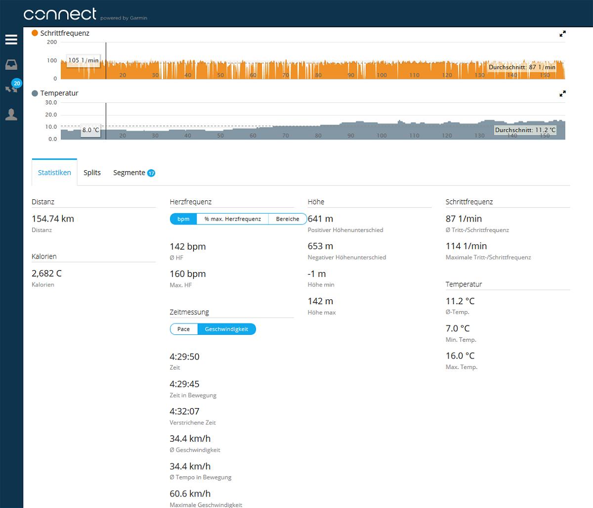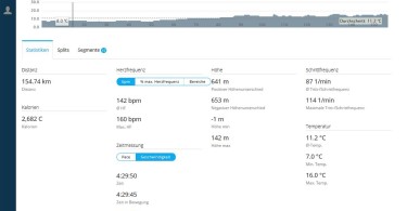 Gefolgt mit Angabe der Höhe, Geschwindigkeit, Herzfrequenz, Trittfrequenz (die hier Schrittfrequenz genannt wird) und der Temperatur. Darunter befinden sich drei Kartenreiter mit den Bezeichnungen Statistiken, Splits und Segmente.