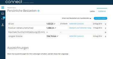 Bei mehreren unterschiedlichen Aktivitäten erhält man eine Zusammenfassung seiner persönlichen Bestzeiten für Geschwindigkeit, Höhenunterschied und Streckenlänge.