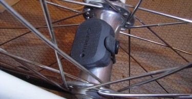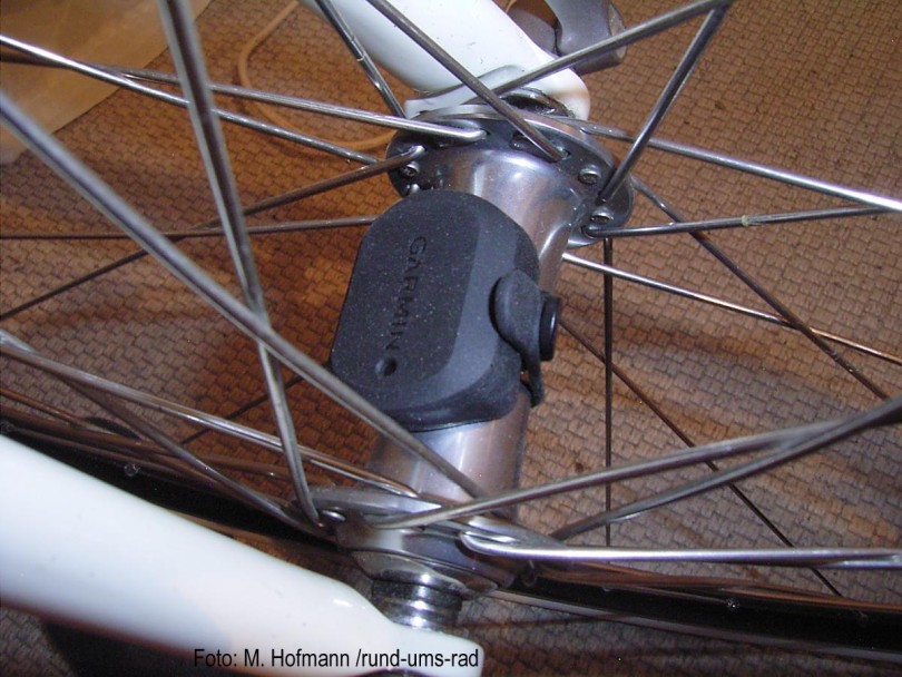 Die Sensoren werden ebenfalls mit Gummiringen befestigt. Als ein Novum sehe ich hier die Montage ohne jegliche Magneten. So wird der Speed-Sensor einfach nur um die Nabe im Vorderrad gelegt. Ein spezieller Sensor erkennt die Radumdrehungen und sendet diese zum Edge 1000. Auch der Trittfrequenzsensor benötigt keinen Magneten und wird direkt an der linken Kurbel befestigt. Dazu liegt ein speziell ausgeformter Befestigunsgummi dabei. Auch hier erkennt ein spezieller Sensor die Kreisbewegung und sendet die Information an den Edge 1000 weiter.