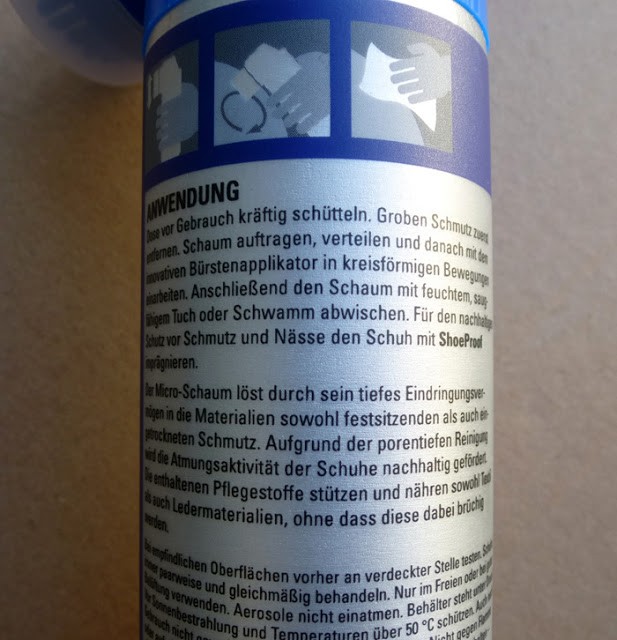 Groben Schmutz vom Schuh entfernen. Dose schütteln. Auf den Pumpmechanismus drücken und den Schaum auf dem Schuh verteilen. Dann mit der Bürste den Schaum kreisförmig einarbeiten. Zuletzt soll mit den Schaum mit einem feuchtem, saugfähigen Tuch oder mit einem Schwamm abwischen.