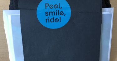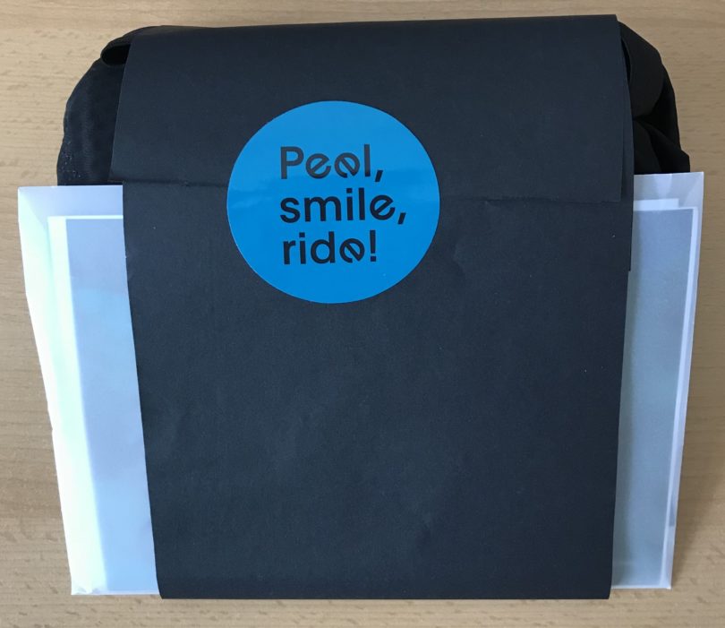 Die Hose wird sehr elegant verpackt geliefert, so ist die Hose in ein schwarzes Band eingepackt und mit einem Brief versehen. Dazu wird ein viel versprechender Kleber mit der Aufschrift “Peel, Smile, Ride!” verwendet. Im Brief enthalten ist die Rechnung, Retour-Anleitung und Informationen zu Everve.