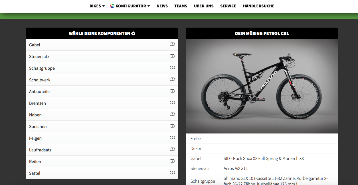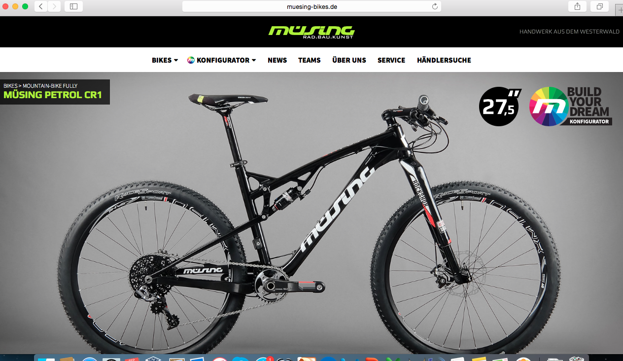Besonders bei Müsing: Alle Bikes lassen sich im Konfigurator nach individuellen Wünschen gestalten. Farbgestaltung mit 221 Rahmenfarben und 50 verschiedenen Dekorfarben, sowie die Auswahl der Komponenten sind möglich: