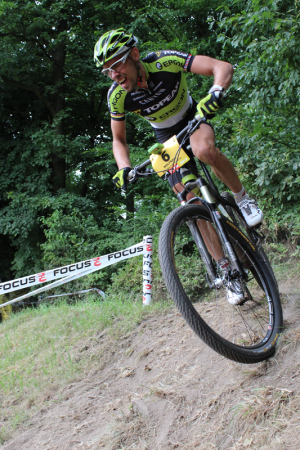 Je Klasseneinteilung müssen die Fahrer zwischen zwei und acht Runden auf der ca. 2,6 Kilometer langen Rennstrecke bewältigen, die mit ca. 110 Höhenmetern teilweise sehr steile Anstiege und ebenso steile und rasante Abfahrten aufweist. Fahrtechnisch wird den Fahrern so einiges abverlangt! Dass der Kurs die ambitionierten Hobby- und Amateurbiker begeistern wird, ist zuletzt auch Wolfram Kurschat (s. Radblogs Archivbild unten), dem Deutschen Mountain-Bike Meister von 1999, 2007 und 2009, zu verdanken, der seine Erfahrungen hier eingebracht hat und sich nahe seinem Zuhauses salopp gesagt seine Trainingsstrecke in den Wald zimmerte. Auch sein Schützling Lukas Baum (Junioren Europameister 2013) profitiert von diesen Bedingungen.