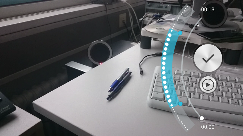 Nachdem man die Aufnahme erstellt hat, kann man im darauffolgenden Menü ganz einfach die Abschnitte auswählen, welche man verlangsamen möchte (im Bild unten, der blau markierte Halbkreis).