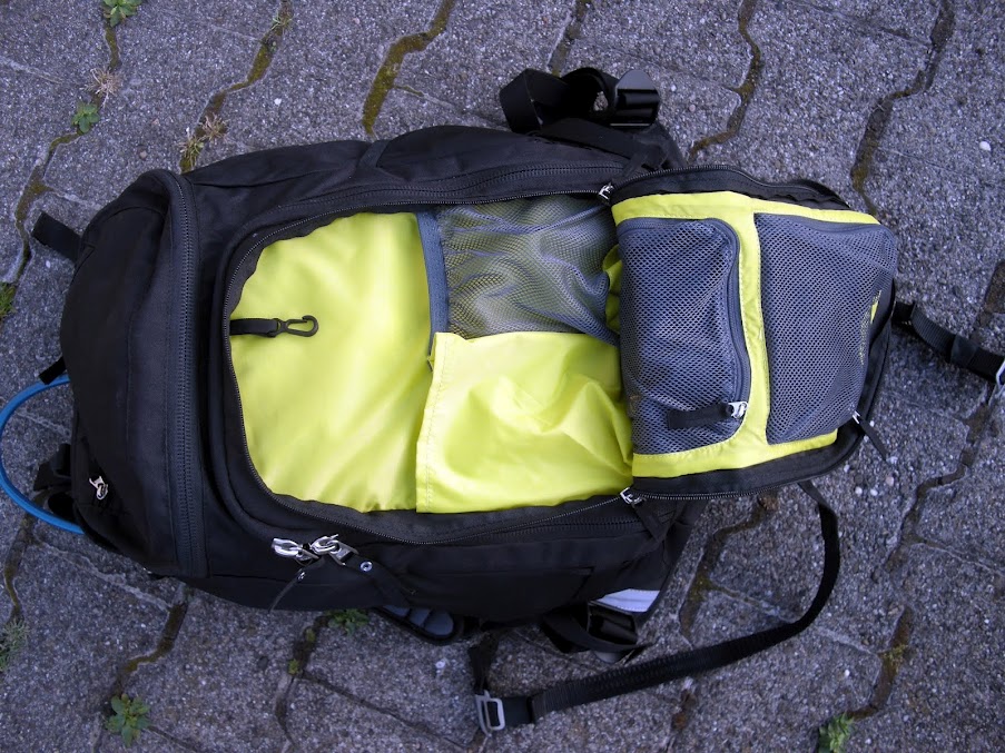 Während der Transalp nutzte ich es für eine 3-Liter Trinkblase und für die feuchten Sachen. Dieses Fach lässt sich bis zur Hälfte der Rucksackhöhe auf beiden Seiten öffnen, d.h. auch, wenn das Fach mal feucht ist, kann es über Nacht schnell trocknen.