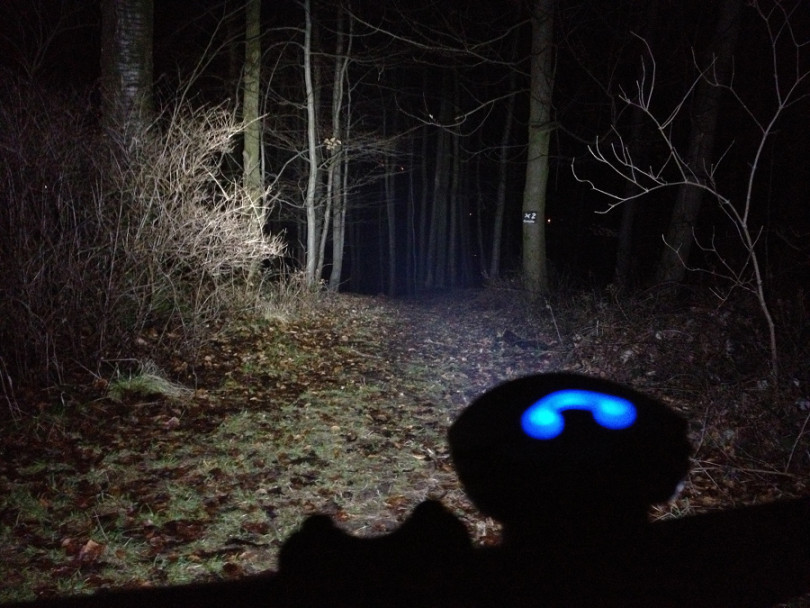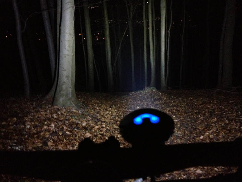 Die Lampe streut zu meiner Zufriedenheit auch etwas zu den Seiten und der Lichtkegel ist nicht zu schmal. Bei kleineren Kurven bleibt der Trail so auch ohne Helmlampe etwas ausgeleuchtet.