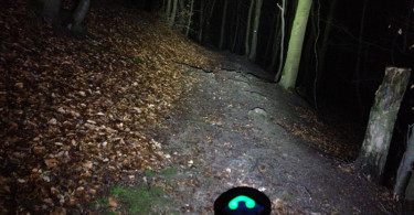 Der erste Singletrail im finsteren Wald ist nur wenige Meter entfernt und ich rase direkt hinein. Trotz Langfingerhandschuhen ist die Lampe perfekt zu bedienen und ich stelle die Magicshine auf die höchste Helligkeitsstufe. Vor mir ist nun der Wald beinahe taghell. Bis in geschätzte 25 Meter Entfernung kann ich jede kleinste Wurzel erkennen. Ich halte kurz an und dokumentiere die beeindruckende Leuchtleistung im Downhill.