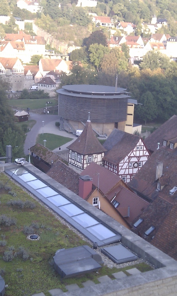 Damit hatten wir dann auch unser nächstes Tagesziel, Schwäbisch Hall erreicht. Dieses Mal war es deutlich einfacher, ein Hotelzimmer zu finden, als bei unserem letzten Besuch. Dafür hatten viele Restaurants Ruhetag. Schließlich fanden wir im Sudhaus an der Kunsthalle einen Platz auf der Dachterrasse mit einem grandiosen Blick über Schwäbisch Hall, unter anderem auch auf den Rundbau, der dem Globe Theatre in London nachempfunden ist.